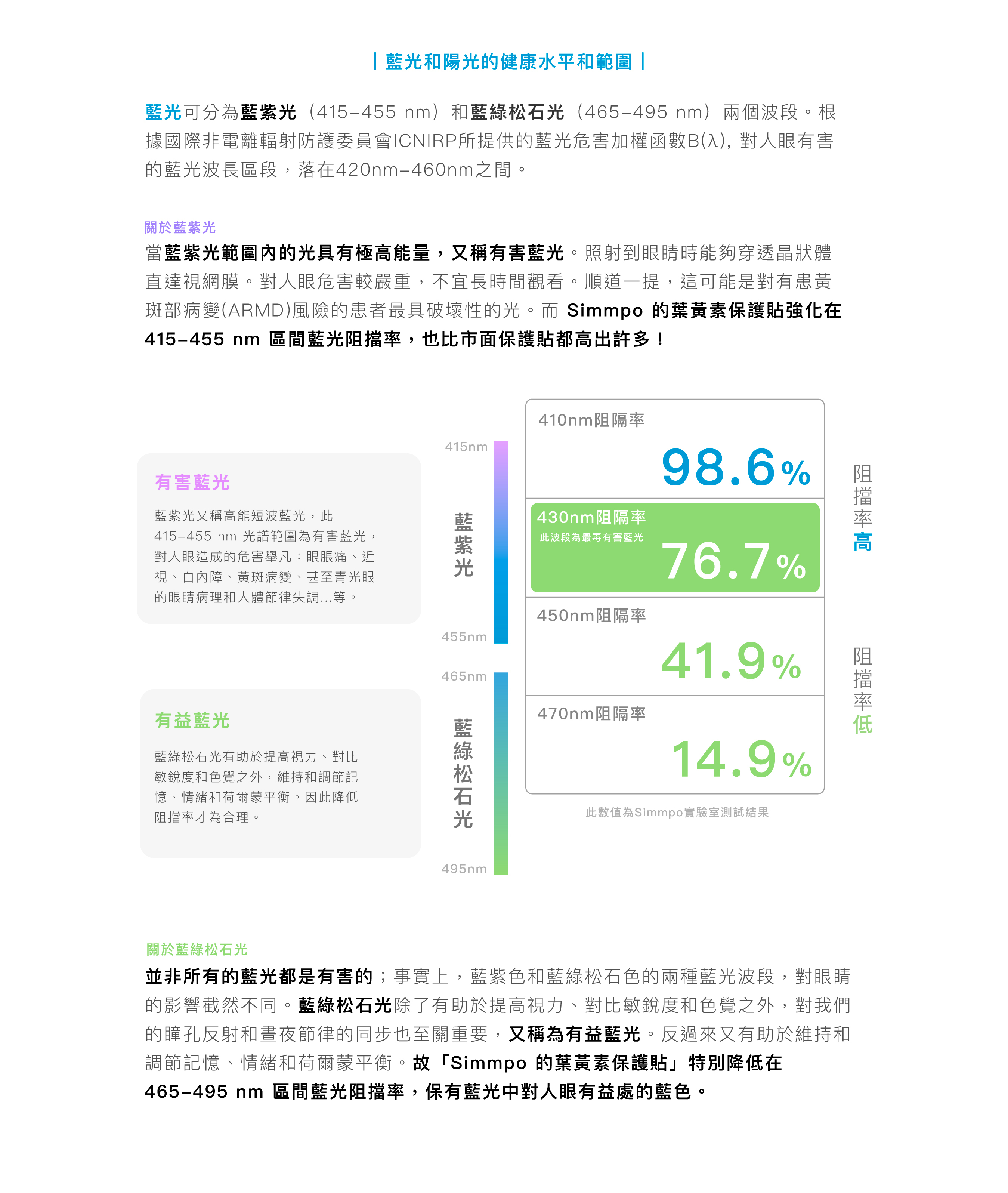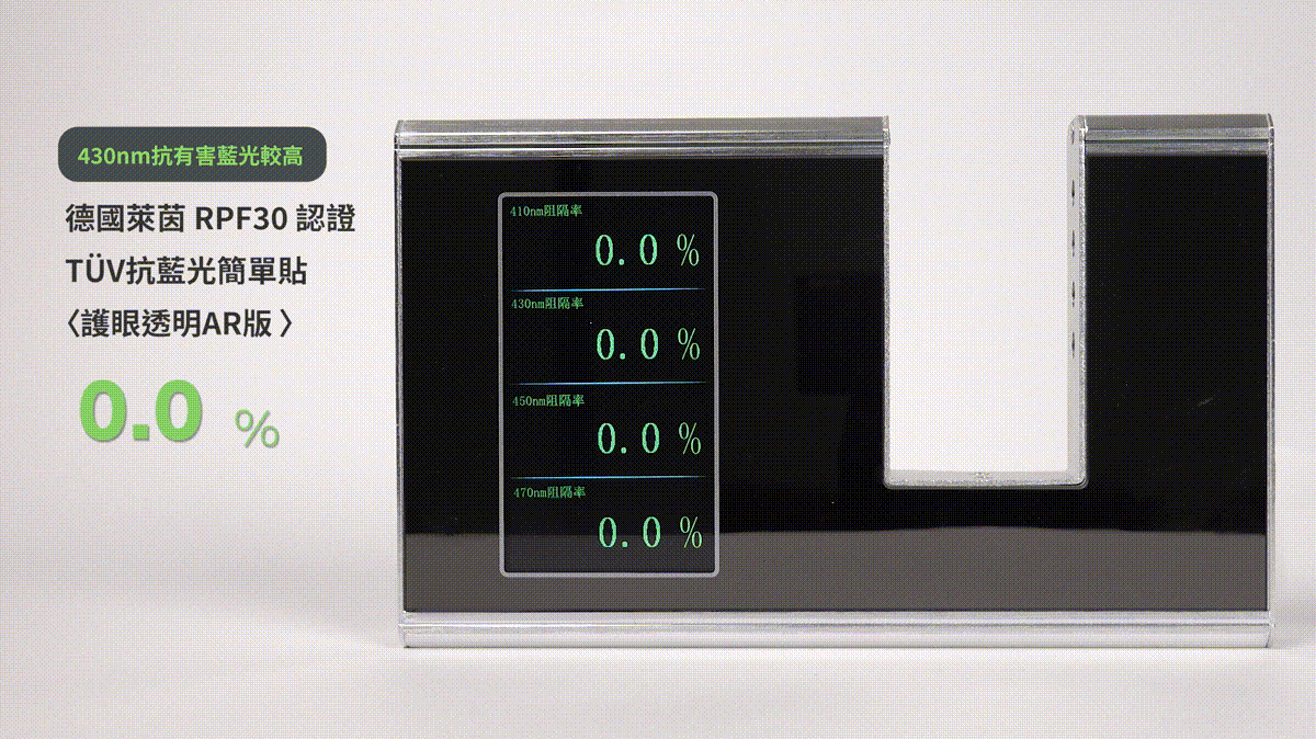 讓眼睛更舒適 打造最高有害藍光  430nm 雙向抵禦力|Simmpo® RPF 30 的 TÜV 抗藍光簡單貼除了可以濾掉超過 64% 以上的 430nm 藍光波段,還可以降低太陽光中有害藍光的反射,讓視網膜處在一個安全的視環境。